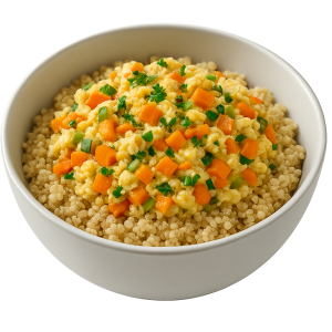 Un cuenco ligero y nutritivo de quinoa cocida, acompañada de un revuelto de huevo y verduras frescas. Perfecto para una comida saludable, rápida y llena de sabor.