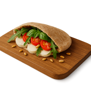 Pan pita integral relleno de mozzarella, tomates cherry, arúgula y albahaca fresca. Una opción ligera, sabrosa y muy fácil de preparar.
